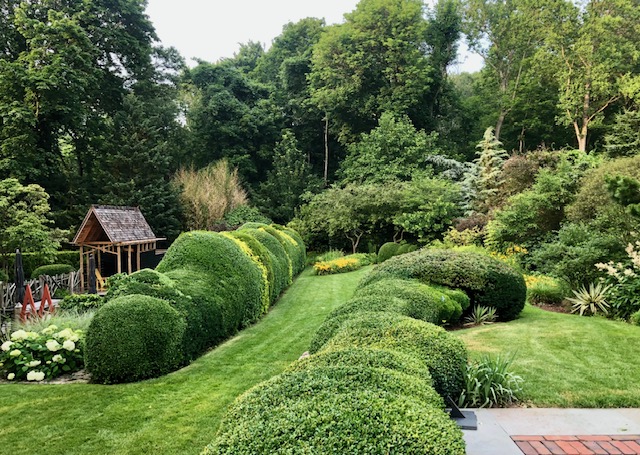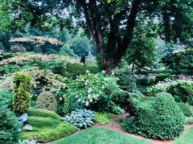 Hedera helix – A long winter of ice and snow takes a toll on this not-always-so-green-evergreen (some cultivars better than others) aggressive ground cover and climber. But the June-September lush new growth is intoxicatingly beautiful and within weeks covers the winter’s expressed weariness. Its leaves bring to mind the laurels worn by Greek and Roman athletic champions or decorations of painted murals in Victorian homes. I have admired it since my youth, remembering how it made a little green lake beneath the pin oak in the Houston home garden of my youth. It also brought a feeling of calm, a relief from the incessant heat, even suggesting a sense of luxe. Years later, now in Connecticut and ready to make Uptop, it was an early must-have for the new garden. The problem: I still have it and in all the wrong places. Naively, I once even decided to contrast the textures of Hedera helix (my old Houston friend) with Pachysandra terminalis (my new Connecticut friend), two aggressive evergreen ground covers. What a mistake, each in a continual war to invade the other’s territory until I ended the war by ripping out all the ivy.